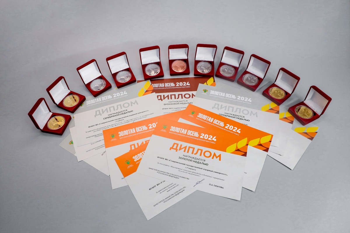 В честь Дня работника сельского хозяйства и перерабатывающей промышленности состоялась 26-я Российская агропромышленная выставка «Золотая осень — 2024». В этом году площадкой проведения мероприятия стал учебно-выставочный комплекс «Тимирязев Центр». В экспозиции выставки традиционно представлены основные достижения АПК регионов, современная сельхозтехника, продукты и услуги для агробизнеса, лучшие породы сельскохозяйственных животных. Традиционно Ставропольский аграрный университет стал обладателем ряда наград: четыре медали за эффективное информационно-консультационное обеспечение АПК и семь — за успешное внедрение инноваций в сельское хозяйство. Из них — четыре золотые, шесть серебряных и одна бронзовая.