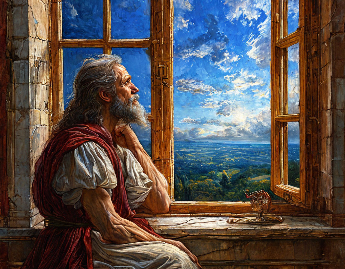 После нескольких часов работы да Винчи решает, что пора сделать перерыв. Он открывает окно, чтобы впустить свежий воздух (и чтобы выветрить запах своих "экспериментальных" бутербродов с рыбой).