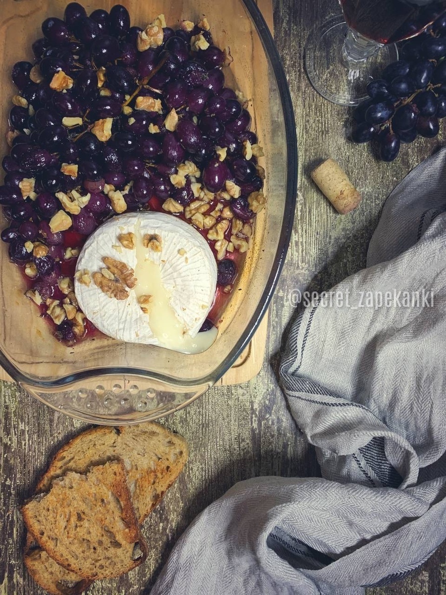 Выходные – это всегда лучшее время для того, чтобы приготовить что-нибудь новенькое. А вечер пятницы – ещё более подходящий момент. Я обожаю этот переход в выходные, каждый раз им наслаждаюсь и жду как маленький Новый год) Так вот, завтра тот самый вечер и разве это не лучшая идея провести его в компании вина, запечённых сыра и винограда. По-моему, то что надо! Возьмём: - виноград киш-миш чёрный без косточек 500 г (1 кисть) - тимьян сухой или свежий по вкусу - пудра сахарная 0,5 ст. л. - соль мелкая 1 щепотка - масло оливковое 1 ст. л. - уксус винный красный 1 ст. л. - сыр камамбер 125 г - орехи грецкие по вкусу Форма любая, у меня 30*21*6 см, объёмом 2 л. Разогреваем духовку до 200С. Виноград заранее промываем, даём ему стечь и обсохнуть. Перекладываем его в форму прямо на ветке, посыпаем тимьяном, пудрой и присаливаем. Слегка поливаем маслом и уксусом. Запекаем 10 минут, пока ягоды не начнут лопаться и давать сок. Переворачиваем кисть. И запекаем ещё 5 минут. Виногра