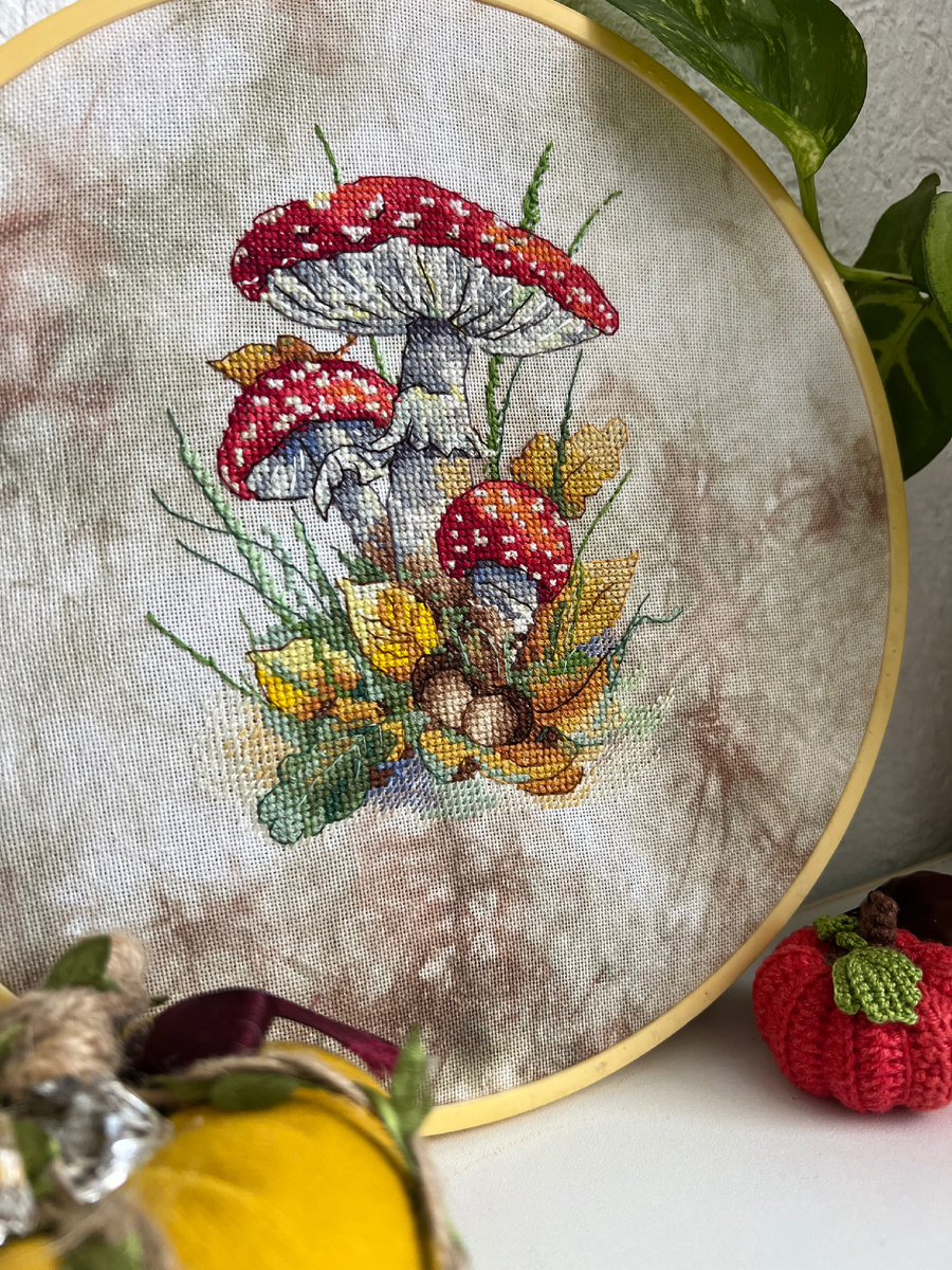Вышивала на беломерке 30 каунта. Окрашивала сама, порошковыми красителями для ткани! Получилось окрашивание 3-мя цветами, с оттенком зеленого, бордового и коричневого, как листва 🍂 осеннего леса! Когда идешь ранним утром, пахнет сыростью и грибами …. Набор вышивался на одном дыхании, легко и приятно! Много бэкстича, который чудесным образом, выделил все важные элементы! Вышивка ждет оформление, а пока, в советских пяльцах ждет рамку! Я склоняюсь к овальному (вертикальному) оформлению! Кажется, что в круге очень много воздуха остается! А как Вам? Как бы оформили? А сейчас буду любоваться готовой вышивкой…начинать новый осенний набор и готовить для Вас новое осеннее видео…Всем спасибо за внимание ‼️ #морекрестиков