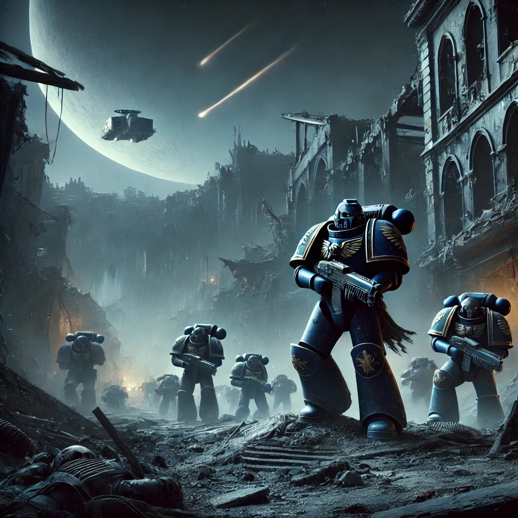 Густой мрак накрыл опустевшие поля колонии Л-9, когда разведывательная группа Ультрамаринов спустилась на поверхность планеты. Эти воины, каждый из которых был легендой сам по себе, ступали на заброшенные улицы, где ещё недавно кипела жизнь. Шлемы, усиленные сканерами и сенсорами, не улавливали ни малейшего признака движения. Только холодная тишина, разорванная шорохом пепла, сыпавшегося с выжженных зданий. Капитан Тирий возглавлял этот небольшой отряд разведчиков. Он был ветераном множества кампаний и сталкивался с многочисленными угрозами Империуму, но то, что происходило сейчас, пробуждало в нём глубокое беспокойство. Врага не было видно, но атмосфера планеты казалась пропитанной угрозой. Он окинул взглядом своих братьев — опытные бойцы, среди которых были ветераны битв против тиранид и орков. Но даже они ощущали нечто неведомое, заставлявшее сжимать оружие крепче. — Сканеры по-прежнему ничего не показывают, — доложил сержант Нерас, сверяясь с данными датчиков. — Ни признаков жизни,