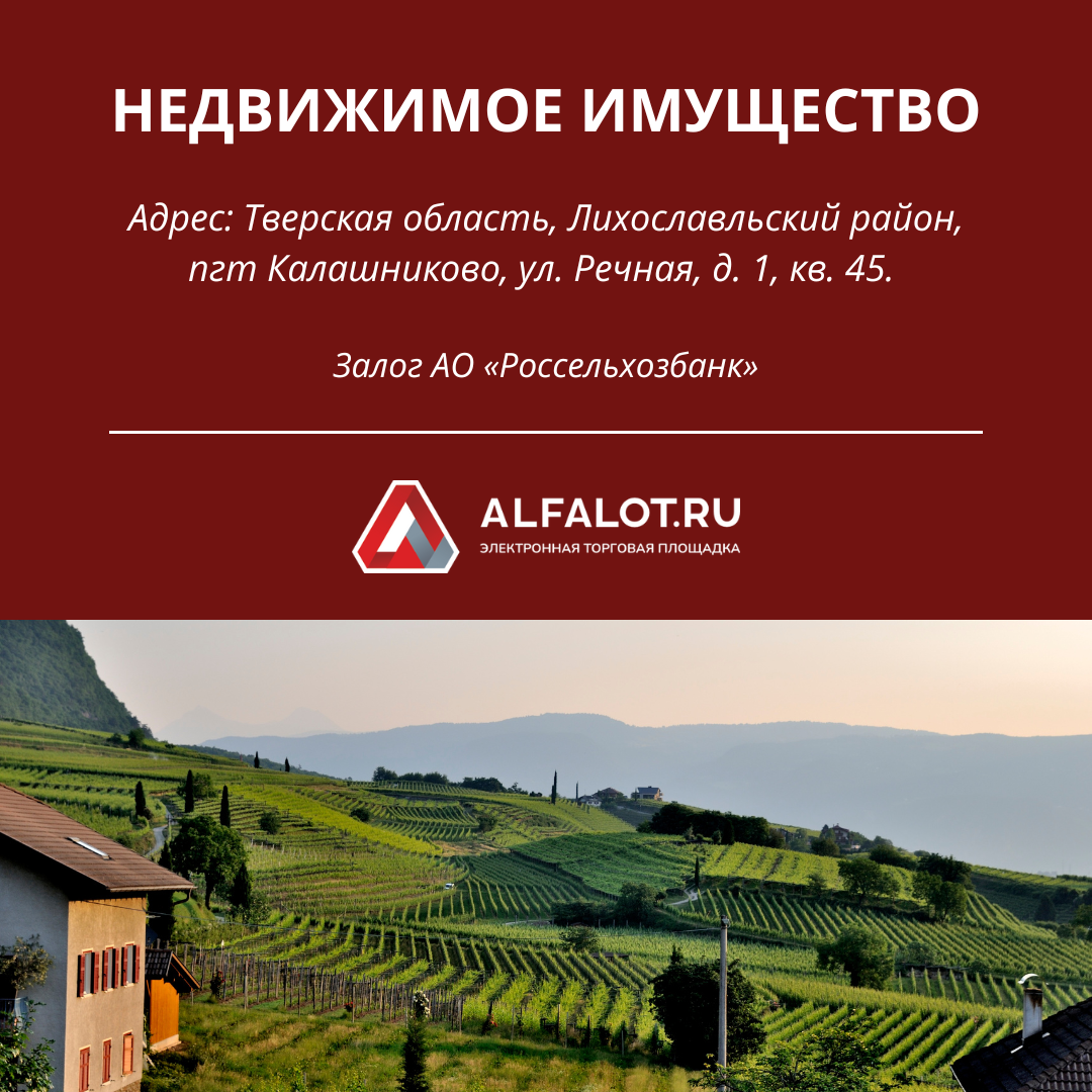 В форме аукциона на повышение продается квартира в Тверской области. Начальная стоимость - 1 056 000,00 р Площадь: 53,8 кв.м. Адрес: Тверская область, Лихославльский район, пгт Калашниково, ул. Речная, д. 1, кв. 45. Кадастровый номер: 69:19:0080111:114. Отделка квартиры: простой ремонт. Сан.узел - раздельный. Кол-во жилых комнат - 3 Имеются все коммуникации. ТОРГИ: ССЫЛКА НА ТОРГИ