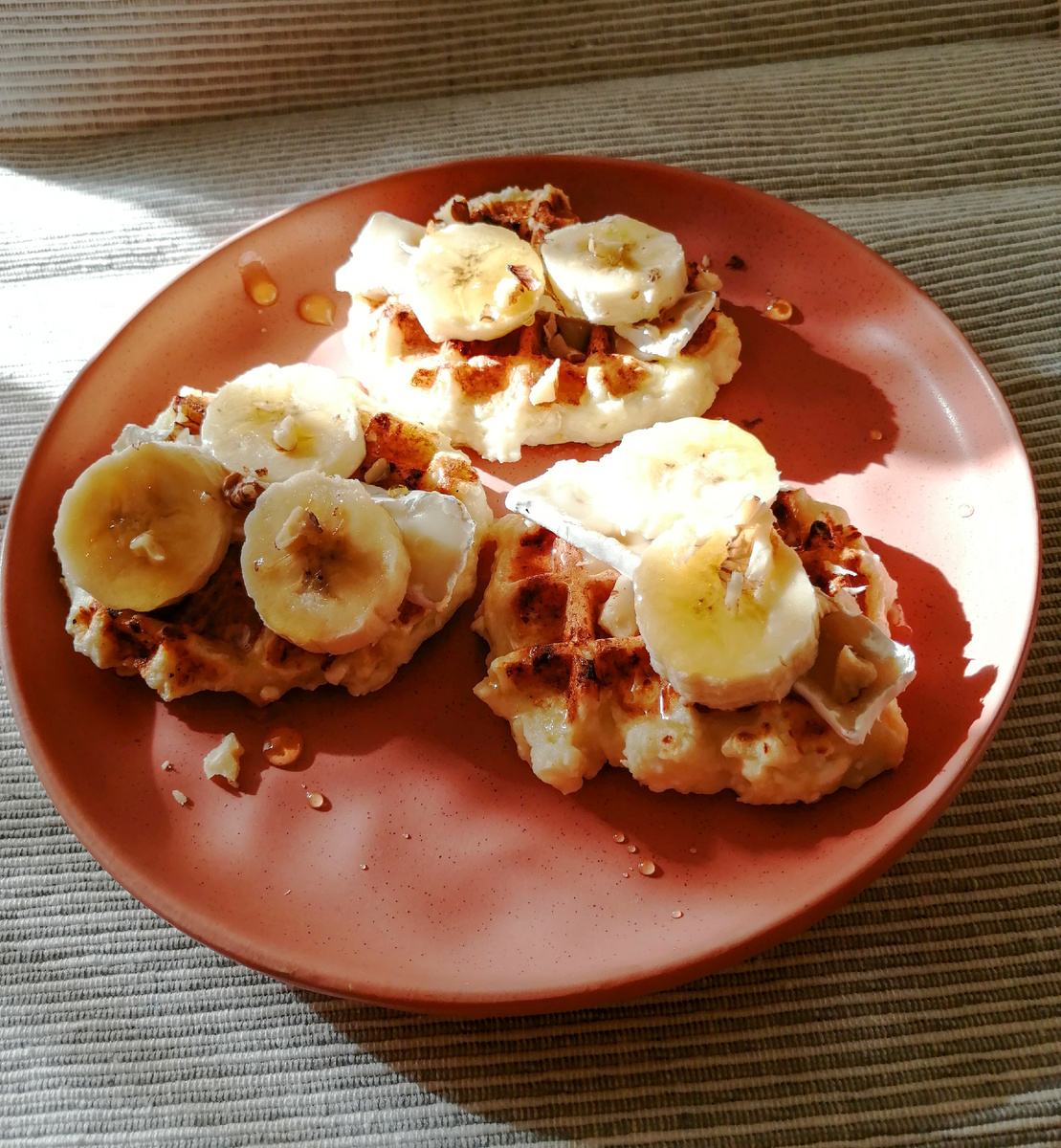 А дальше украшаем её по своему желанию. Мне нравится сочетание сладкого с солёным, поэтому у меня на вафлях сыр бри и банан, политые мёдом и посыпанные грецкими орехами.