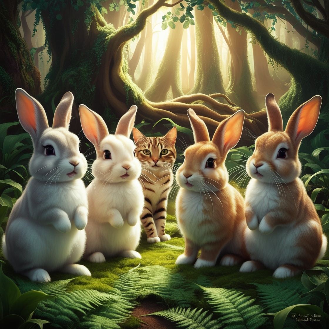 Это был Волшебный лес, где буйные тянутся к облакам и искрятся ручейки. Там жил кролик по имени Кувырок с верными друзьями: белоснежной Снежинкой, всегда игривым Прыгунчиком и заботливой Пушинкой. Каждый день они гуляли и резвились, исследуя тайны Волшебного леса.