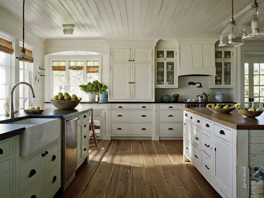 Кухонные шкафы в пляжном стиле привносят атмосферу летнего отдыха в любое время года. Они обычно выполнены в светлых тонах с элементами из натуральных материалов, создавая ощущение простоты и естественности.