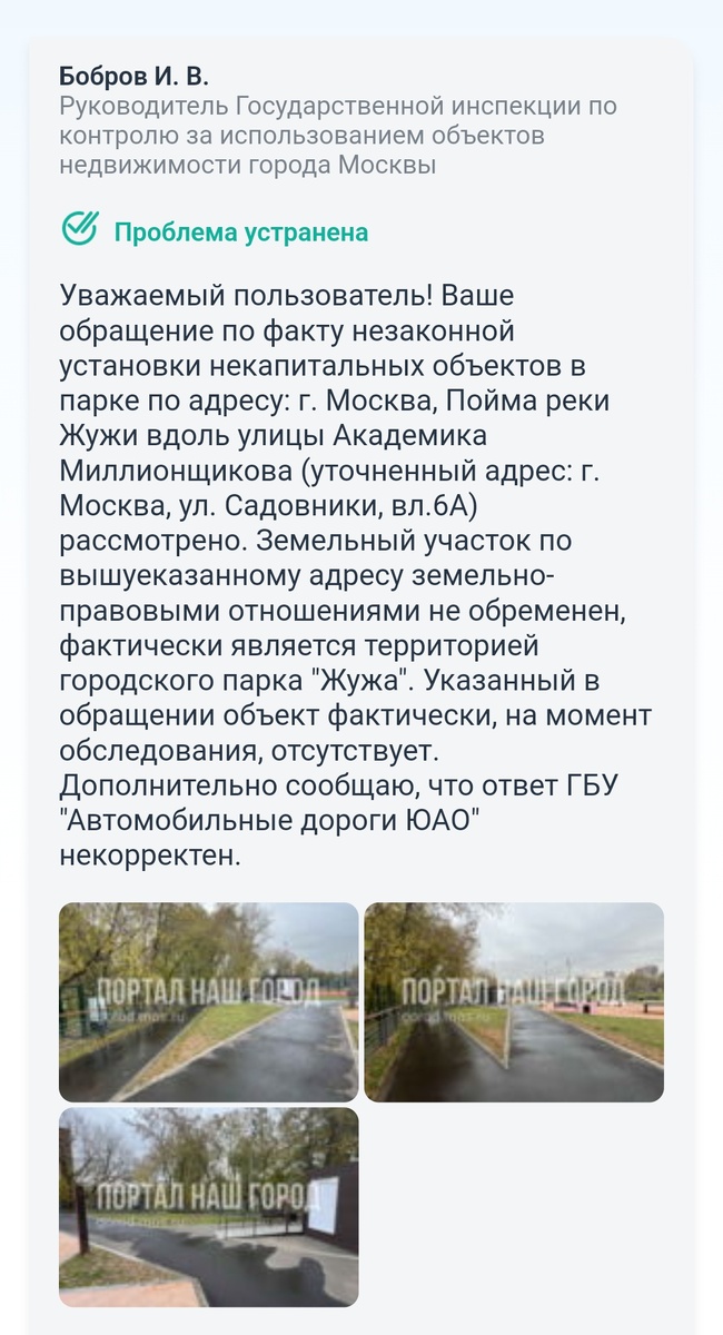 Мои подписчики интересуются - а когда же будет продолжение рассказа о переехавшей будке? Ловите! Государственная инспекция по контролю за использованием объектов недвижимости города Москвы по результатам проведённой проверки сообщает, что предыдущий ответ ГБУ "Автомобильные дороги ЮАО" был некорректным... Так вот в чём причина переезда будки охраны на другое место... Что ж, такая работа заслуживает моей высшей оценки! Проблему устранили, сообщение закрываю.