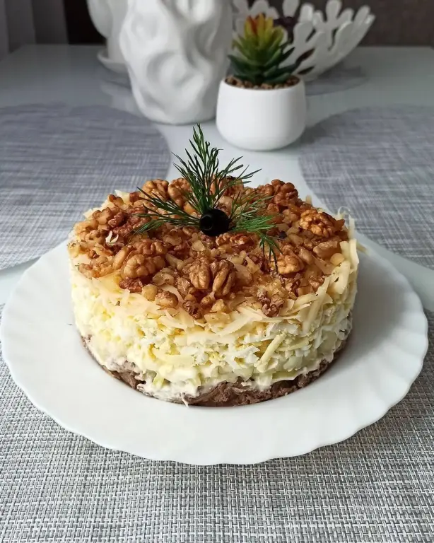 Собрать салат слоями чередуя сеточкой майонеза , верх украсить грецкими орехами! Слой яиц присыпать солью.В разъемом кольце такие.