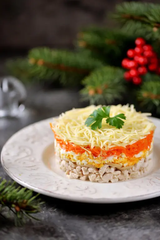 Ингредиенты Приготовление: Курицу и яйца отварить и остудить заранее, тогда на приготовление салата у вас уйдет совсем мало времени. Яйцо обычно готово за 10 минут, а если куриное филе разрезать вдоль на две части, то 15 минут ему достаточно для варки. Нарежьте куриное филе мелким кубиком, выложите его в сервировочное кольцо на плоскую тарелку. Курицу чуть посолите и поперчите, смажьте тоненькой майонезной сеточкой. Нарежьте маринованные шампиньоны тонкими ломтиками, выложите слоем на курицу. Натрите яйца на крупной терке, выложите следующим слоем, его также смажьте майонезом. Я использовала одно яйцо, в натертом виде его более чем достаточно на это количество продуктов. Корейскую морковь нарежьте мелко, так ее будет удобнее есть в готовом салате, этот слой тоже нужно слегка смазать майонезом. Все слои слегка утрамбовывайте тыльной стороной ложки. Последним слоем положите натертый на мелкой терке твердый сыр. Аккуратно снимите кольцо, украсьте веточкой свежей зелени и подавайте к ст
