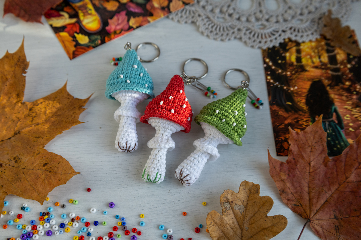 Материалы и инструменты: 1. Пряжа Jeans от Yarn Art (55% хлопок, 45% полиакрил; 160 м в 50 г). Два цвета. 2. Пряжа Begonia от Yarn Art (100% хлопок, 169 м в 50 г). Трава. 3. Бисер, размер ~ 9/0 – пупырочки на шляпке. 4. Швейная нить, для пришивания бисера. 5. Наполнитель: Синтешарики. 6. Крючок 2,0 мм. 7. Основа для брелока – если творите его. 8. Ножницы. 9. Игла. Обозначения: вп –воздушная петля сбн – столбик без накида сс – соединительный столбик сС1Н – столбик с одним накидом приб – прибавка (2сбн провязанные в одну петлю) уб – убавка (2сбн провязанные вместе и образующие в итоге 1сбн) (.....)*6 – действие в скобочках повторяем 6 раз Приятного вязания :) Шляпка: Пряжей нужного цвета. 1р: Набираем 2вп и во вторую петлю от крючка вяжем 5сбн. 2р: приб; 4сбн = 6сбн. 3р: (1сбн; приб)*3 = 9сбн. 4р: 9сбн. 5р: (2сбн; приб)*3 = 12сбн. 6р: (5сбн; приб)*2 = 14сбн. 7р: (5сбн; приб; приб)*2 = 18сбн. 8р: 6сбн; приб; приб; 7сбн; приб; приб; 1сбн = 22сбн. 9р: 7сбн; приб; приб; 9сбн; приб; приб; 2с