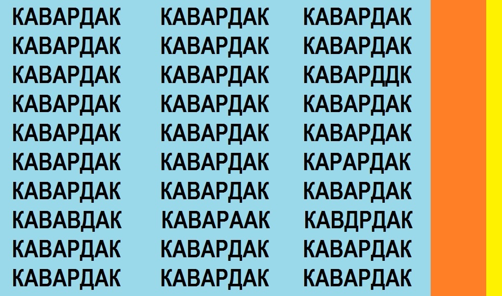 Пусть "кавардак" не присутствует у нас ни в быту, ни на работе, ни в личной жизни... Пусть он останется только в задании на развитие внимания, в качестве зарядки для мозга. В этом задании, состоящем из многократно напечатанного слова "кавардак" постарайтесь найти 5 ошибок-описок, как можно быстрее. Сколько секунд у Вас на это ушло? Выполните задание на следующий день, и вновь засеките время. Есть ли прогресс в выполнении задания (в развитии внимания)? Вы также на этом задании можете развивать ещё и долговременную память, если будете выполнять его ещё несколько раз, но делая промежутки между выполнениями уже в 2-3 дня. P.S. Это удивительно, но , если Вы овладели навыком рассматривания стереокартинок, о котором говорилось в этой статье: то ошибки-описки будут сами проявляться в виде мелькающих бликов правильных букв над неправильными. Попробуйте, получится ли у Вас это? Находите ошибки-отписки и оставляйте ответы в комментариях. Быстро ли Вам удалось справиться с заданием? Испол
