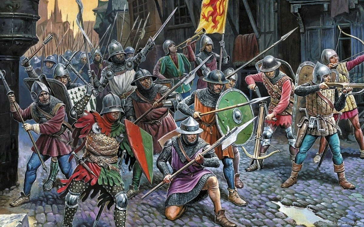 В средневековой Европе города, особенно с приобретением привилегий и статуса свободных городов, играли важную роль в политической и военной жизни своих регионов. Они стали не только центрами торговли и ремесел, но и важными опорными пунктами обороны, с собственными вооруженными силами, которые обеспечивали защиту и поддержание порядка внутри и вне городских стен. Вооруженные силы средневековых городов были организованы на основе городского ополчения, состоящего из жителей города, главным образом из ремесленников, торговцев и других горожан. Каждый мужчина, который мог держать оружие, считался потенциальным воином и обязан был участвовать в защите города. Горожане делились на цехи — объединения ремесленников по профессиям (например, кузнецы, плотники, ткачи). Цехи были не только экономическими и социальными структурами, но и военными единицами. Каждый цех выделял отряд ополченцев, которые должны были в случае нападения участвовать в обороне города. Часто для поддержания военной подготов