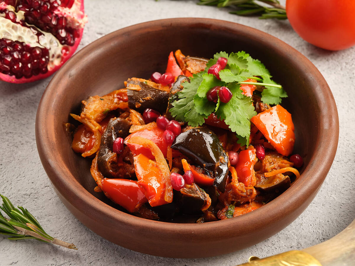 Аджапсандали — это блюдо грузинской кухни, которое представляет собой овощное рагу с добавлением зелени и специй. Название блюда происходит от грузинских слов «аджари» (из Аджарии) и «сандали» (рагу). Ингредиенты: Приготовление: Баклажаны нарезать крупными кубиками, посолить и оставить на 15 минут, чтобы они пустили сок. Затем промыть баклажаны под водой, чтобы убрать горечь. Сладкий перец очистить от семян и нарезать крупными полосками. Помидоры нарезать крупными кубиками. Репчатый лук нарезать полукольцами. Разогреть растительное масло в сковороде и обжарить лук до золотистого цвета. Добавить баклажаны, сладкий перец и помидоры в сковороду к луку. Тушить овощи на среднем огне, периодически помешивая, до мягкости баклажанов. Чеснок мелко нарезать или пропустить через пресс. Острый перец очистить от семян и мелко нарезать. Кинзу, базилик, петрушку и укроп мелко нарезать. Добавить в сковороду чеснок, острый перец, зелень, соль, чёрный молотый перец и хмели-сунели. Перемешать и тушить ещ
