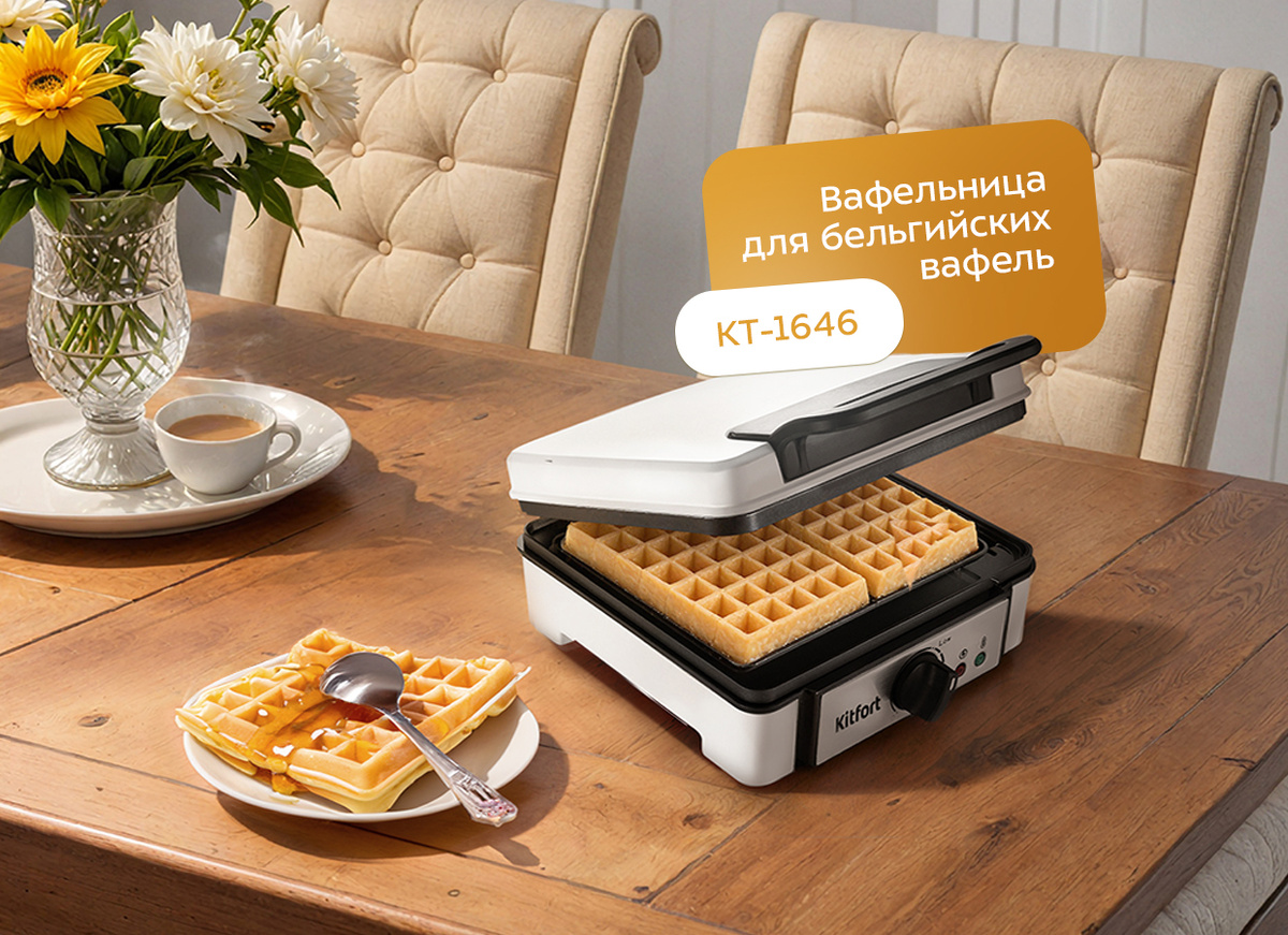 У каждого бывают дни, когда не хочется ломать голову над сложными завтраками, а приготовить что-то простое и вкусное, но при этом сытное и полезное. Хотим предложить вам вафельницу для бельгийских вафель Kitfort KT-1646, которая будет радовать вас питательным и вкусным завтраком или ужином, а также сладким и ароматным десертом, стоит только добавить подсластителя, ягод и других ингредиентов. С помощью электрической вафельницы Kitfort KT-1646 можно испечь наивкуснейшие толстые бельгийские вафли особой удлинённой формы за считанные минуты! Размер. Вафельница Kitfort KT-1646 имеет компактный размер, так что её можно удобно расположить на кухонном столе, и она не будет мешать при готовке других блюд. За один раз можно приготовить 2 пышные и крупные вафли. Вид. Бельгийские вафли завоевали популярность благодаря своей толщине и невероятно глубокими кармашкам, которые идеально подходят для наполнения маслом, джемом или кленовым сиропом. Часто эти вафли толще своих американских аналогов и гото