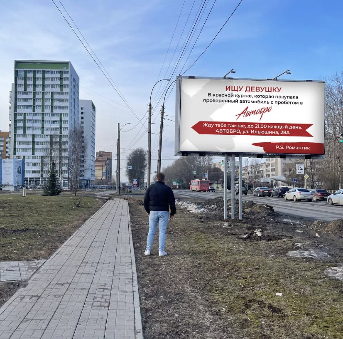 Идея: Фото рекламного щита с текстом: «Ищу девушку в красной куртке, которая покупала проверенный автомобиль с пробегом в «Автобро». Жду тебя там же, до 21:00 каждый день. «Автобро», ул. Ильюшина 28А. P. S. Романтик