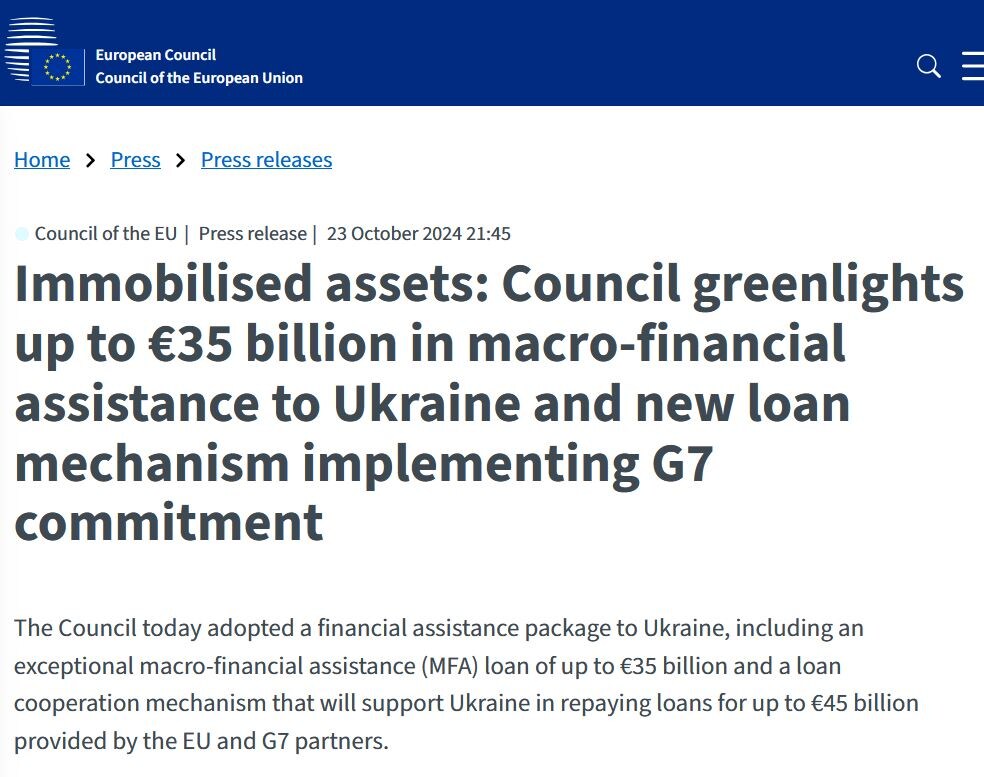 Раньше предполагалось, что Украина будет получать прибыль от замороженных активов России (около 3 млрд евро в год). И первый такой транш в 1,5 млрд евро уже даже был предоставлен 26 июля 2024. Теперь все меняется: все эти деньги будут предоставлены Украине до конца 2024 года (через бюджет ЕС).
