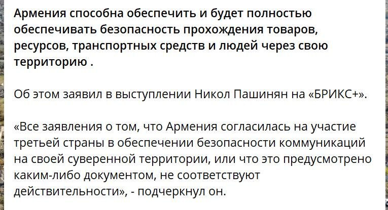 Сегодня, на расширенной встрече лидеров стран близких к БРИКС — БРИКС+, Пашинян удивил заявлением по Зангезурскому коридору. Фактически напрямую, при высоких свидетелях, пошел против России и заключенного Трехстороннего Соглашения. Однако это только на первый взгляд так кажется. Хитрый Никол Воваевич играет словами. С одной стороны, чтобы не вызвать отрицательную реакцию Москвы, с другой, чтобы предстать в Армении героем, который на глазах у всех идет против позиции РФ. На самом деле, никто и не говорил об "обеспечении безопасности" коммуникаций. Речь шла о "контроле". Более того, по Трехстороннему соглашению безопасность должна обеспечивать сама Армения. Смешной малыш так примитивно пытается манипулировать, что так и хочется воскликнуть "какая милота". А в это время весь Армнет выставляет цитату Пашиняна. В этом и есть вся прелесть управления народом отвыкшим смотреть на мир открытыми глазами. Им фактически зачитывают 9 пункт Соглашения от 10 ноября 2020 года, а они в экстазе. Навер