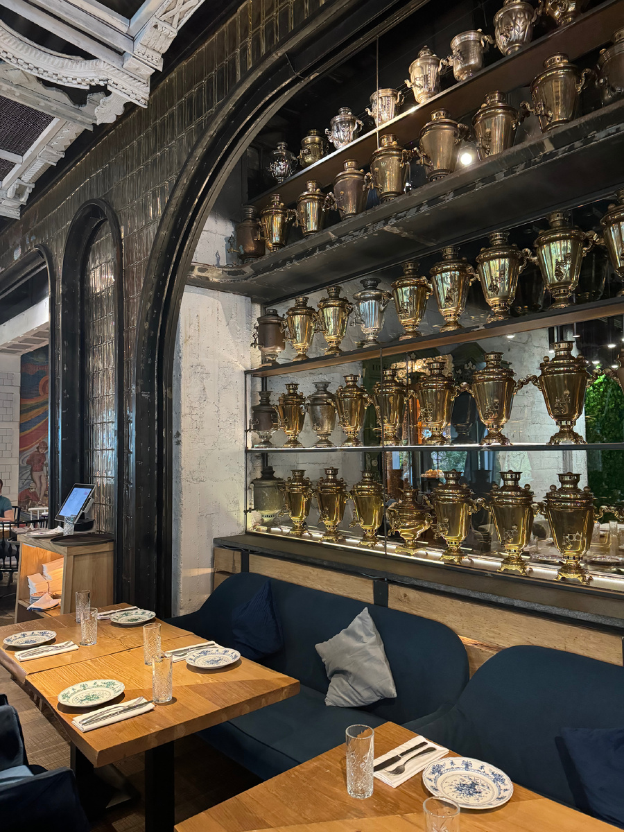 Сибирь Сибирь и фестиваль «Русский завтрак» Очень атмосферно, проект Дениса Иванова #СибирьСибирь, ресторан современной и традиционной кухни Сибири. Поразил необычный интерьер, вызывающий желание рассмотреть каждую деталь. В интерьере активно используют: самовары, чайники, скворечники, стёганые подушки, одеяла, различные соленья и другие элементы русско-сибирского быта. Так, например, стена с валенками и шалями, создающая очень уютную, тёплую зону. Или потолок в баре: десять тысяч ложек, которые эффектно переливаются, приковывая внимание. Стена из настоящих стволов деревьев вызвала восторг, а сверху сотни шишек. Еще одним оригинальным декор решением является отдельный тематический зал «Водочная», в котором собрано порядка 740 бутылок. Необходимо отметить, что в интерьере использовано множество дорогих материалов: ясень, дуб. По вечерам здесь топят печь, живой огонь – важное дополнение атмосферы, ведь как в Сибири без огня. Фестиваль Русский завтрак АМАРАНТОВАЯ КАША СО СПЕЛОЙ