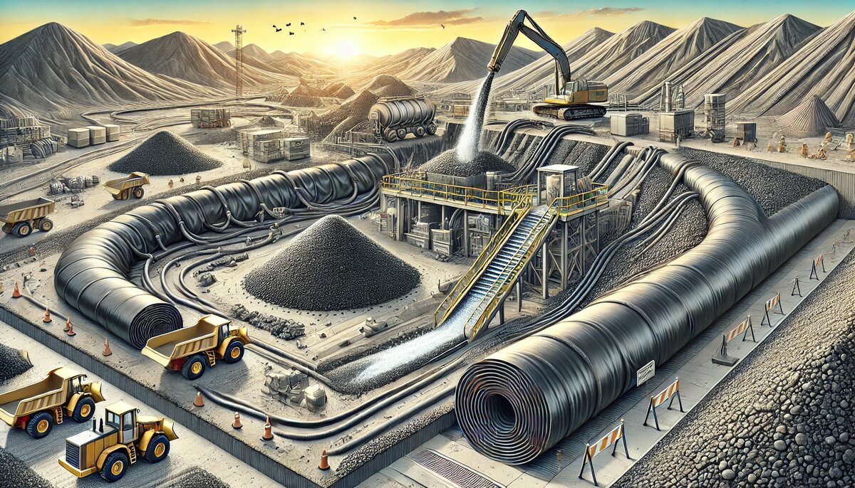Кучное выщелачивание — это одна из ключевых технологий в горнодобывающей промышленности, используемая для извлечения ценных металлов, таких как золото, серебро, медь и уран, из руды. Основой этого метода является укладка дробленой руды в большие кучи, через которые проходят специальные химические растворы, выщелачивающие металлы. Для того чтобы предотвратить утечку химических веществ в почву и окружающую среду, необходимо создать эффективный барьер, и полиэтиленовые геомембраны играют здесь критически важную роль. Кучное выщелачивание предполагает использование агрессивных химических растворов, таких как цианиды или серная кислота, которые могут нанести непоправимый вред окружающей среде, если они попадут в почву или грунтовые воды. Главная цель использования полиэтиленовых геомембран — обеспечение надежной герметичности и предотвращение проникновения этих растворов за пределы зоны выщелачивания. Высококачественные полиэтиленовые геомембраны, такие как геомембраны из линейного полиэтил