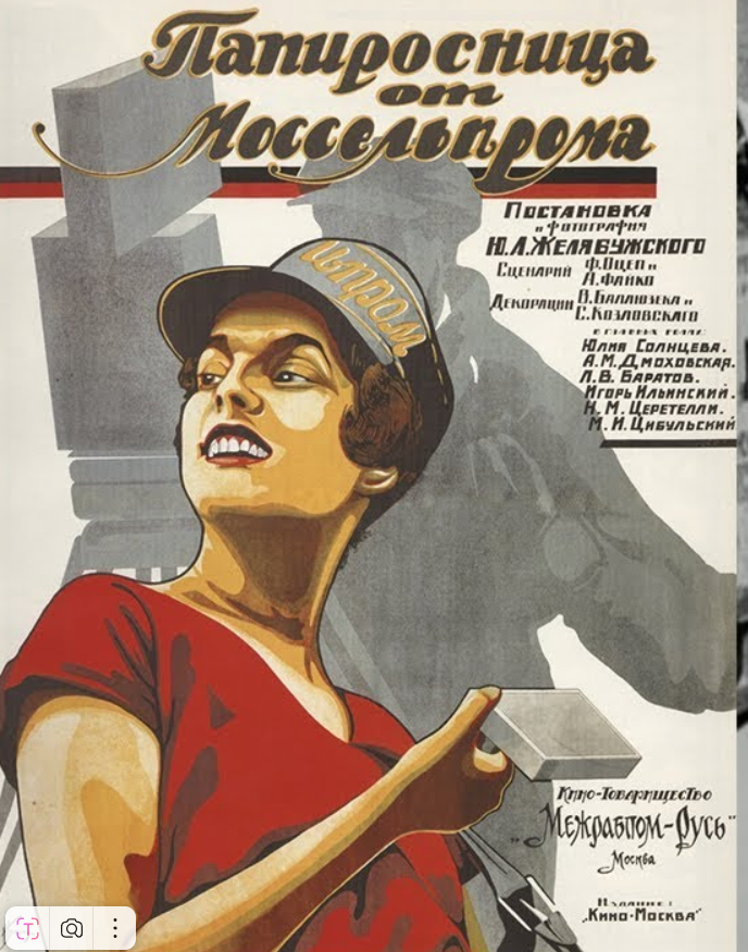 Это — не *Кармен*, и папиросница не набивает гильзы на табачной фабрике. Да и певческо-музыкальными талантами не обладает. А фильм и вовсе *немой*. Страсти неиспанские, бытовые московские 1924 года. Красавица Зина в форменном кепи привлекательна. и для некурящего мелкого служащего Никодима — хранит десятки купленных у неё коробок, как святыню; и для кино-банды, гоняющей на авто по городу на натурные съёмки, чей оператор Латугин — длинное худое лицо, английская клетчатая фуражка и трубка (тип *Шерлок Холмс* полюбился киноиндустрией в начале её развития!)— сразу приметил и решил занять Зину в съёмках; и для американского бизнесмена Оливера Мак-Брайдта — карикатурно-толстый капиталист показан без классовой злобы. Напротив, — как попутчик Совроссии. Инвестор из США, прибывший для размещения заказа в швейной промышленности и съёмок документального фильма о Москве. В то время как правительство его страны не признавало советскую страну. До 1932 года, кстати. Хоть немного, хот