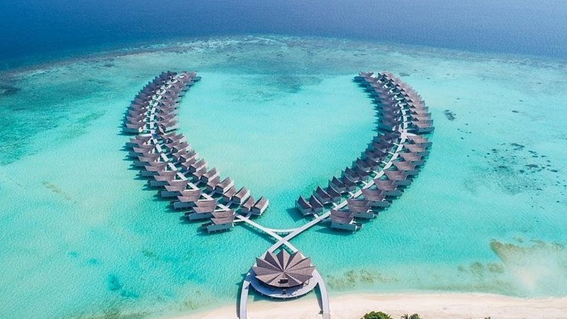 Overwater pool villa lagoon: Эт0 140 м² виллы расположены над лазурной лагуной и имеют стеклянные полы, раздвижные стеклянные двери, бассейн с бесконечным краем, а также спальню и ванную комнату с потрясающим видом на океан. Виллы располагаются на двух параллельных понтонах, поэтому стоит отметить, что террасы не обеспечивают полной приватности.