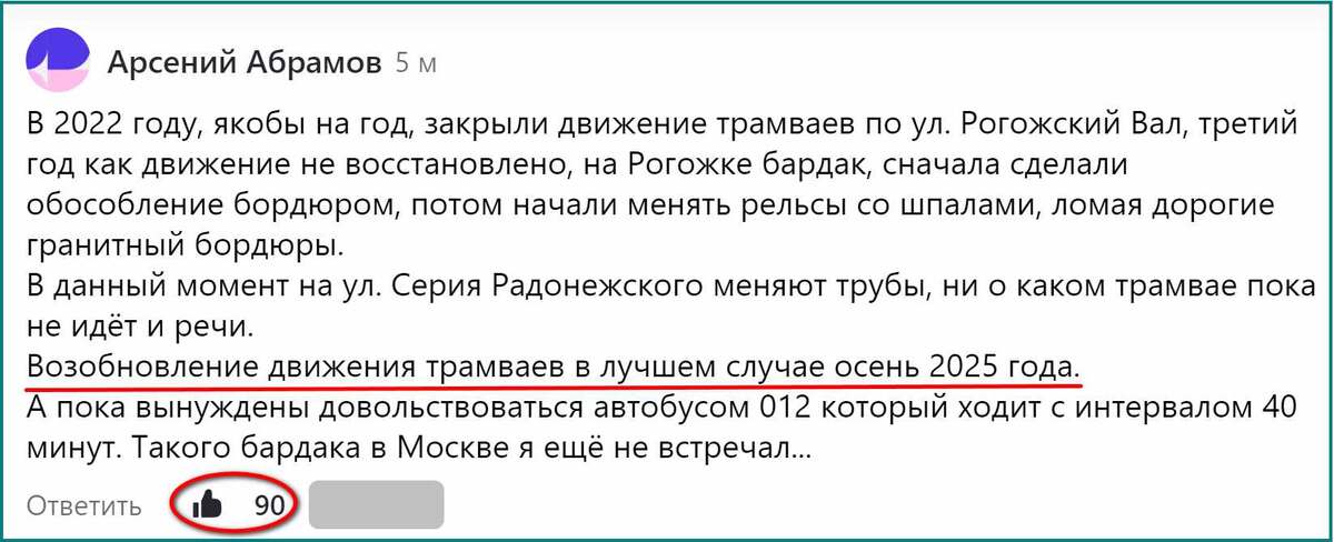 На канале «Записки о Москве» уже дважды публиковались статьи о строительстве новой трамвайной линии на улице Сергия Радонежского. Почему-то некоторые читатели были очень скептически настроены относительно сроков окончания работ. Обращаю Ваше внимание, что к этому комментарию было поставлено 90 лайков, то есть, по крайней мере, почти сотня читателей считала, то трамвайная линия не будет сдана до конца 2024 года. Несмотря на сомнения, открытие движения состоялось 23 сентября, и на торжественной церемонии присутствовал мэр Москвы Сергей Собянин. Меня, к сожалению, не пригласили, поэтому я поехал тестировать новую линию только на следующий день. Напомню, что трамвайные пути разобрали на Тулинской улице (так тогда называлась улица Сергия Радонежского) ещё в начале 50-х. Перенесли трамвайное движение на Школьную улицу. Спустя 30 лет рельсы демонтировали уже со Школьной улицы. Московский трамвай очень популярен у жителей Москвы, и демонтаж путей воспринимается горожанами весьма болезненно. А