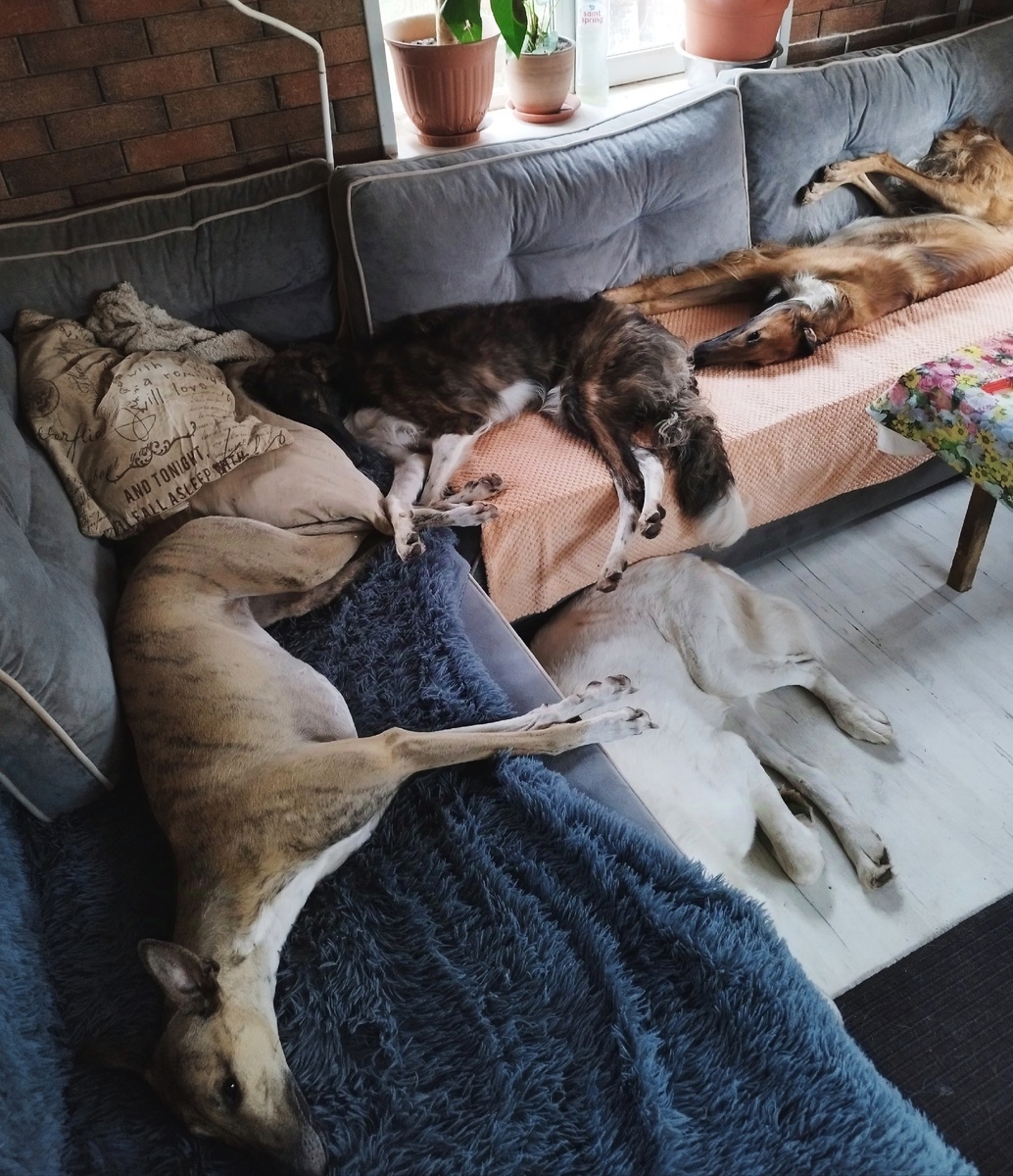 Очень часто от потенциальных рук мы слышим, что борзая и квартира не совместимы. Мол большая собака, ей надо много места. В квартире негде "погулять" и развернуться. Спешу заверить, что это очередной миф наравне с "борзым надо много бегать". Более комфортной и как бы это не казалось странным-маленькой собаки в ограниченном пространстве я не встречала. Дома борзая ведёт себя аналогично кошке, почти все время спит. Позовешь-подойдет, но никаких игрищ, беготни и никакой навязчивости по отношению к хозяину вы от неё никогда не увидите, если конечно это не грейхаунд🤦♀️Я говорю по большей части о русских псовых) У меня в доме сейчас живёт 19 собак, из них 16 борзых. И если не знать об этом количестве, вы никогда не догадаетесь, потому что дома-тишина, никто не лает, не бегает, и не доставляет друг другу никаких неудобств. Только Марвин иногда ворчит как старик, и то потому что его кто-то из собак задел проходя мимо дивана😌 У борзых теперь три отдельные комнаты, одну занимает Б