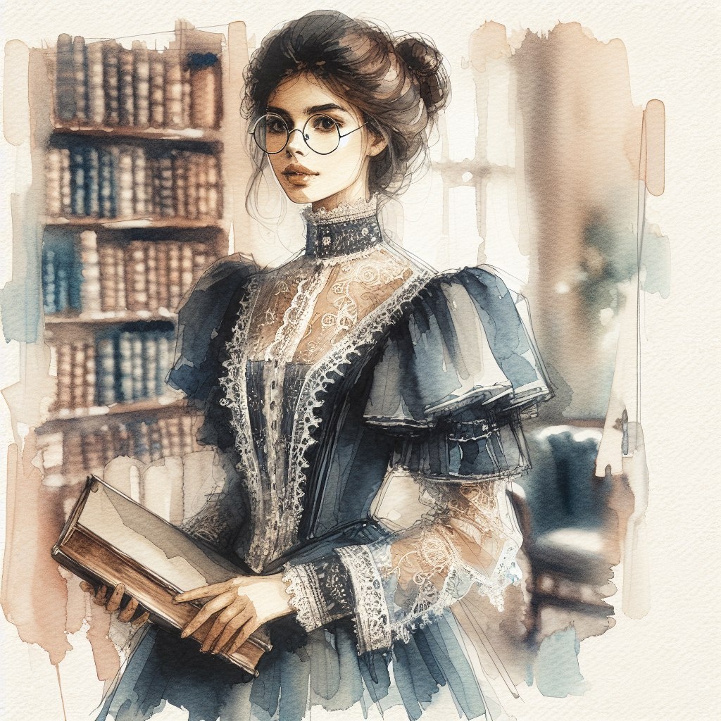 Она стройная, носит очки, одета в длинное темно-синее платье. Выглядит довольно скромно. Лицо очень умное. А в руках у нее несколько книг. Она прижимает их к груди и идёт в библиотеку.