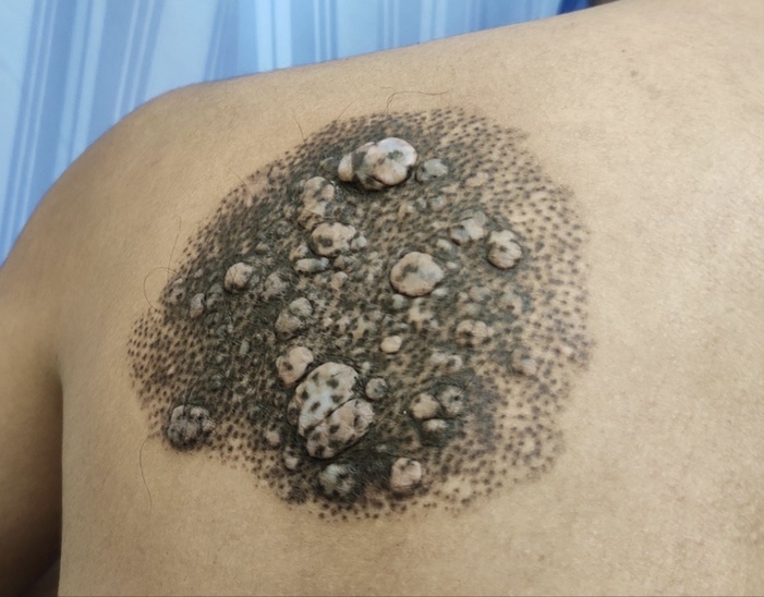 У 24-летнего мужчины на левой верхней части спины появилось медленно растущее, бессимптомное, четко очерченное образование размером 20 см, состоящее из нескольких небольших, расположенных в центре фолликулов, отдельных или сливающихся друг с другом, коричневато-черных или синюшных пятен. На месте поражения также были обнаружены множественные мягкие, четко очерченные папулы и узелки с вышележащей фолликулярной пигментацией. Гипертрихоза или сопутствующих дефектов опорно-двигательного аппарата обнаружено не было. Дерматоскопия выявила сосредоточенную в фолликулах пигментацию от коричневато-черного до синеватого цвета с сетчато-глобулярным рисунком на фоне нормальной кожи. При гистологическом исследовании в дерме были обнаружены скопления однородных невусных клеток, окружающих волосяные фолликулы, а также большое количество меланофагов. Основываясь на клинических признаках, дерматоскопии и гистопатологии, мы диагностировали это как врожденный фолликулярный меланоцитарный невус, также назы