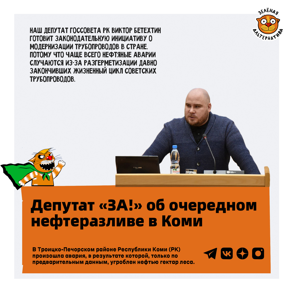 В Троицко-Печорском районе Республики Коми (РК) произошла авария, в результате которой, только по предварительным данным, угроблен нефтью гектар леса. Инцидент случился на участке трубопровода, принадлежащего компании «Нижнеомринская нефть». На месте происшествия работают специалисты и сотрудники прокуратуры. Наш депутат Госсовета РК Виктор Бетехтин готовит законодательную инициативу о модернизации трубопроводов в стране. Потому что чаще всего нефтяные аварии случаются из-за разгерметизации давно закончивших жизненный цикл советских трубопроводов. Виктор ещё в прошлом году после разлива на Южно-Ошском нефтяном месторождении призывал обратить внимание на современные композитные материалы, свойства которых куда лучше созданных уже не существующей страной. Поэтому он будет продвигать экоинициативу через Палату молодых законодателей при Совете Федерации РФ, членом которой является. Напомним и о другой нашей инициативе, актуальной при большинстве похожих ЧП — национализировать компании, рук