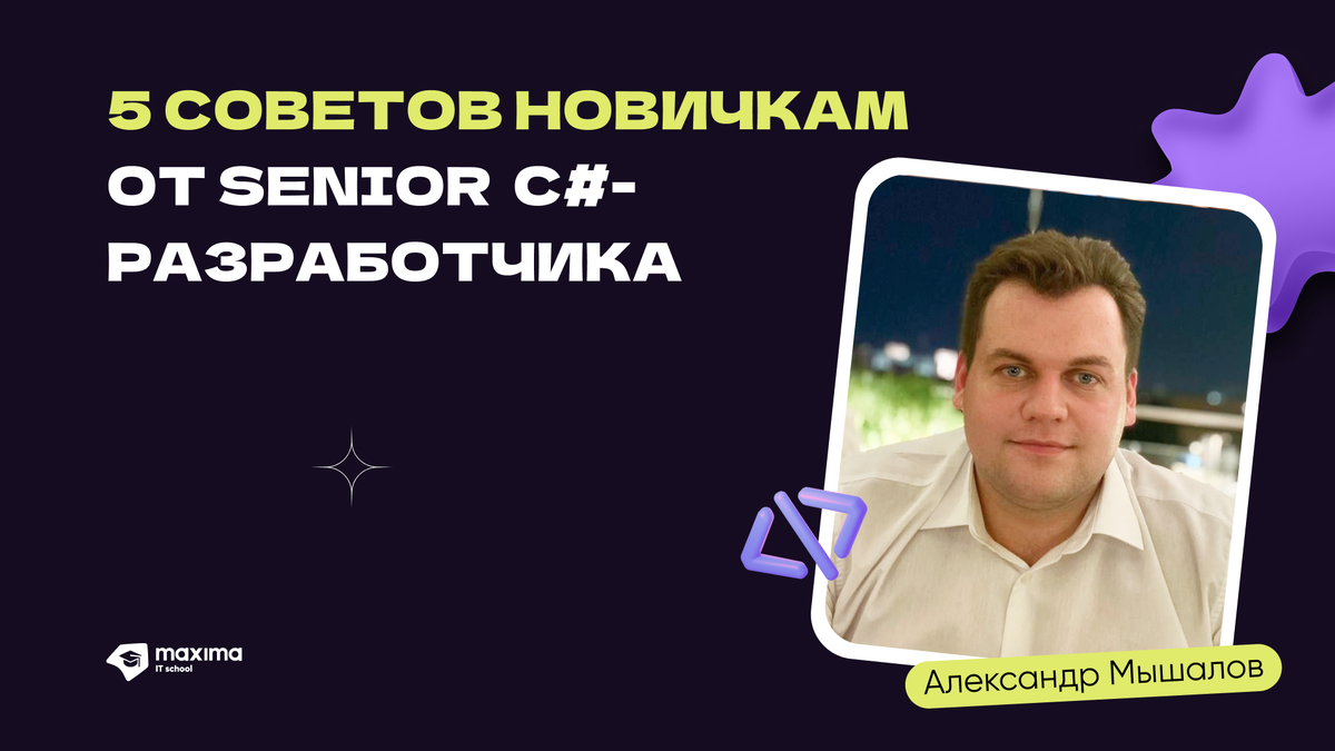 Александр Мышалов преподает курс «Основы программирования на C#» в учебном центре Maxima. Несколько фактов об Александре: — более 5 лет в разработке — на протяжении трех лет преподает образовательные программы — стал ментором для молодых специалистов в компании, где работает 1) Попробуй разные языки, но остановись все равно на одном Я к C# пришёл не сразу. До этого успел попробовать приличное количество языков: Java, Ruby, C++, Python. В какой-то момент понял, что пора прекратить метаться с языка на язык и остановиться на одном. C# мне приглянулся очень приятным синтаксисом (по мне, он в разы лучше, чем у Java) и тем, что язык постоянно развивается, в нем появляются новые возможности, а что-то сложное наоборот упрощается. Также на рынке, достаточно много вакансий по С# и, в основном, это большие проекты. 2) Хватайся за любые возможности получить опыт На старте я бы старался искать любой доступный опыт. Например, фриланс. Я начинал с него. Стажировок, к сожалению не так много, но если п