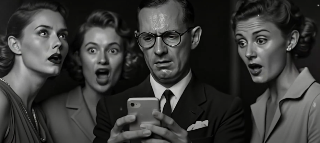 Это был обычный день, ничем не примечательный. Вечерний парк, легкий ветерок, неспешные шаги мужчины, одетого в костюм 1930-х годов. Он наслаждался тишиной и свежестью, пока что-то блестящее на земле не привлекло его внимание. Под ногами лежал странный предмет — гладкий, черный и абсолютно непонятный. Мужчина наклонился и поднял его, разглядывая с удивлением. Это был телефон, но совсем не тот, к которому он привык. Стеклянная поверхность без привычных кнопок и металлический корпус казались чем-то нереальным, как будто этот предмет прибыл из далекого будущего. Вернувшись домой, мужчина с гордостью показал странный предмет своей жене и её подругам. Те, отложив чашки с чаем, окружили его, словно магический артефакт. Одна из женщин осторожно прикоснулась к устройству, словно боясь, что оно исчезнет, если коснуться его слишком сильно. Другая шептала подруге, пытаясь разгадать, что это могло бы быть. Но среди любопытных взглядов нашлась одна, полная недоверия и страха. Одна из подруг быстро