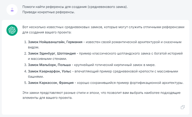 - 😎 3D моделлеры на связи?) Делать 3D-модели конечно весело, но не так быстро, верно? Да и в принципе в профессии есть много сложностей, и что же делать? Использовать ChatGPT конечно) Он очень хорошо ускоряет работу) - Уверен, что 100 раз слышали про Chat gpt, НО эти 10 вариантов откроют новые границы) - - - 1. Поиск референсов: ▼ Заправка: Помоги найти референсы для создания (средневекового замка). Приведи конкретные референсы. Супер) https://chat.aiacademy.me/share/03ad31688317297812214817 (ссылка на этот результат, можете потестить на своей теме). - - - 2. Технические советы: ▼ Заправка: Действуй, как 3D-моделлер. Как оптимизировать (UV-развертку для низкополигональной модели?) Супер) https://chat.aiacademy.me/share/caa73169101729781810c703 - - - 3. Пошаговое объяснение ▼ Заправка: Действуй, как 3D-моделлер. Твоя задача - дать мне самые подробный и четкий план для (создания модели обезьяны в блендере). Представь, что абсолютный новичек, мне нужны шаги, чтобы я с нуля смог создать м