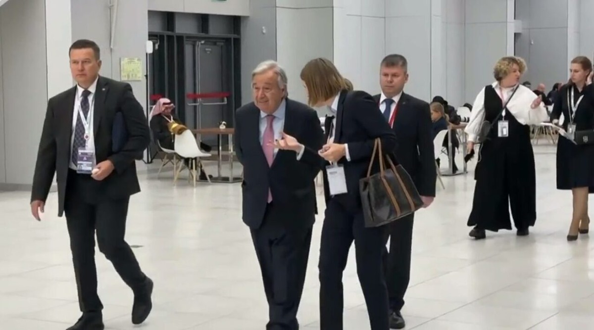 Гутерриш гуляет по выставочному центру «Казань Экспо» после заседания «БРИКС плюс»