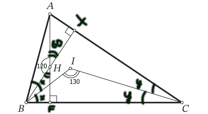 Высоты остроугольного треугольника ABC, проведённые из вершин A и B, пересекаются в точке H, причём ∠AHB=120∘, а биссектрисы, проведённые из вершин B и C, — в точке I, причём ∠BIC=130∘. Найдите величину угла ABC. Во-первых, если посмотреть на треугольник BIC, то становится очевидно, что х+у=50. Теперь делаем хитрый финт ушами - если сложить углы В и С, то получим 2х+2у, т.е. 100, а значит угол А в треугольнике АВС равен 80. Факт интересный, но пока бесполезный. Теперь смотрим на второй известный нам угол - АНВ. Сразу понимает, что смежный ему угол равен 60, а у этого смежного есть вертикальный и он тоже 60. Теперь если пристально взглянуть на треугольник АНХ, то становится понятно, что угол А в нем равен 30 градусов. Ровно такая такая же история с треугольником BHF. Угол HBF в нем равен 30 градусов. Теперь понятно, что нам осталось найти угол АВН и мы ответим на вопрос. Смотрим на треугольник АВН. Вспоминаем бесполезный факт про то, что угол ВАС равен 80 градусов. Но мы уже вычислили