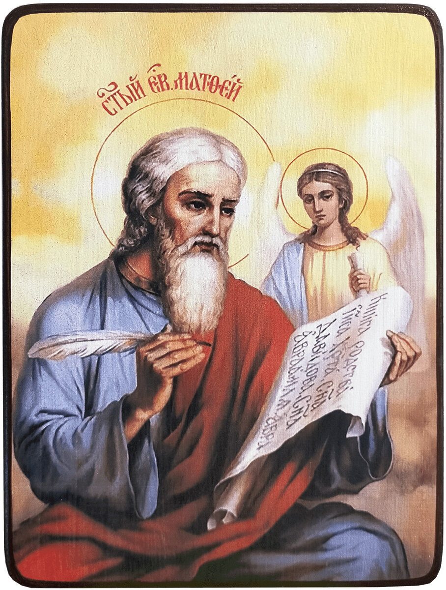 Святой апостол Матфей , второе имя которого Левий, жил в городе Капернауме и был мытарем. Когда он узнал об Иисусе, бросил всё и пошёл за Ним. Матфей пригласил Спасителя и Его учеников к себе, и они посетили его дом. Фарисеев очень возмутило то, что Христос общается с мытарями, но Господь "пришёл призвать не праведников, а грешников к покаянию". Матфей раскаялся в своей прежней жизни, всем, кого он обманул, собирая подати, он вернул вчетверо. Остальное своё имение он раздал нищим и отправился за Христом. После Вознесения Господня Матфей 8 лет проповедовал в Палестине. Предположительно, там он и написал своё Евангелие. Апостол писал его на еврейском языке, для иудеев. Лишь позже Евангелие от Матфея было переведено на греческий. Матфей проповедовал для людей, которые ждали Мессию, поэтому основная цель его Евангелия - показать, что Христос есть истинный Мессия, предреченный пророками. После 8 лет в Палестине апостол Матфей обошёл с проповедью Сирию, Лидию, Персию, закончив мученической к