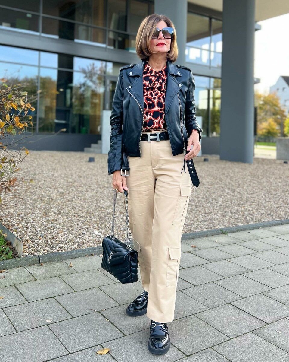 - Стильный и немного дерзкий образ получится, если дама 60+ наденет брюки-карго светло-бежевого оттенка с карманами, принтованную блузку и кожаную байкерскую куртку. При желании можно подчеркнуть линию талии ремнем или поясом. Удачно дополнят образ черные лоферы, сумка и очки.