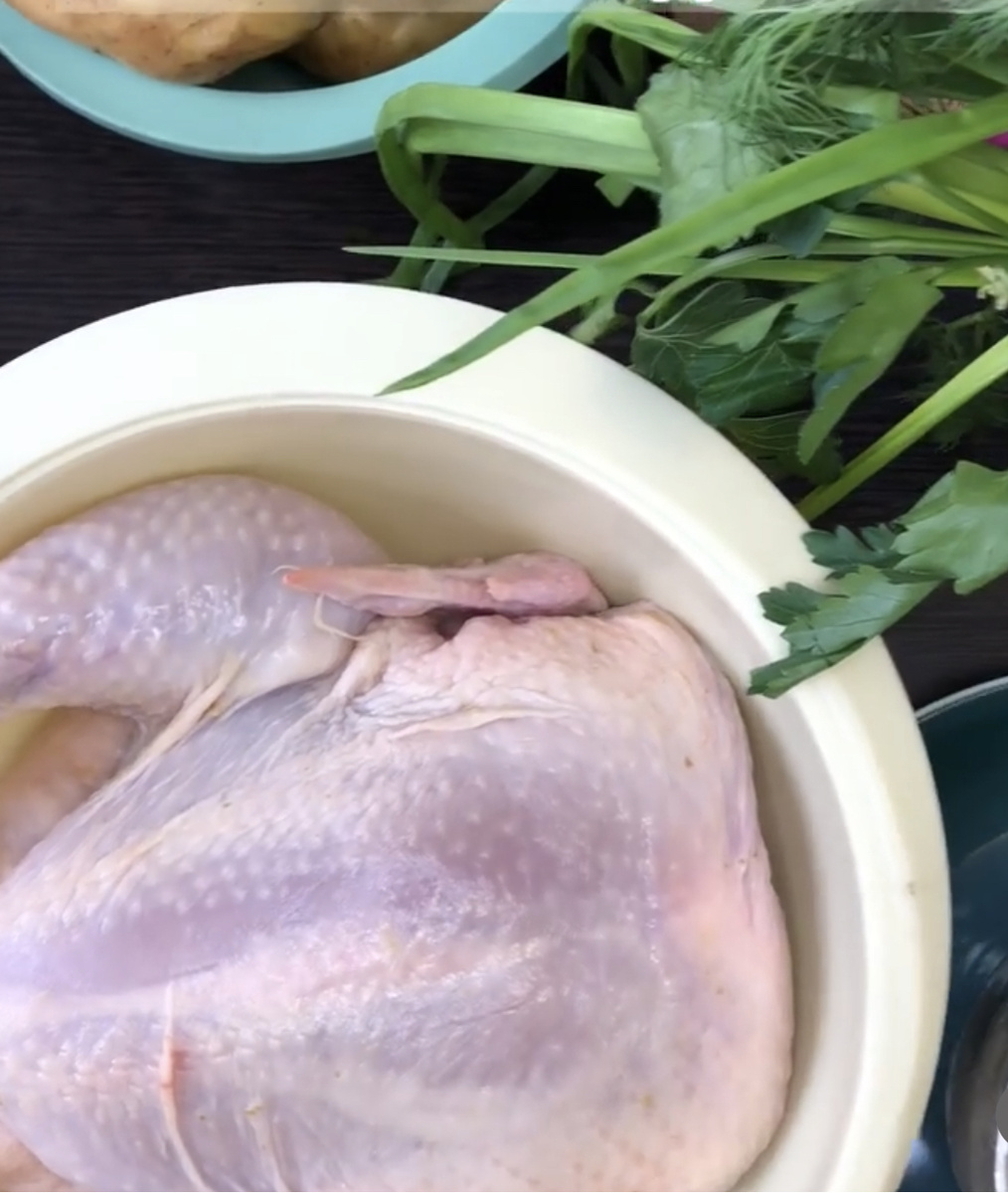 Когда приносишь домой куриную тушку, сколько блюд приходит на ум? )) 2,3, 4 или 5? Я предлагаю разнообразить меню) 9 блюд из одной курицы! Готовы?! Поехали! Для начала разделываем курицу. И у нас получилось: 2 голени 2 бедра Хребет 2 крылышка(разделим на 4 части) 2 филе грудки(разделим ещё наполовину) Сразу ставим варить на суп-пюре хребет и косточки с бёдер. Пока бульон варится мы подготавливаем другие ингредиенты. И начинаем готовить сразу 3 блюда (будем запекать их вместе) отбивные с сырной шапочкой. Для этого нам понадобится: 1/2 куриного филе. Для сырной шапочки: Яйцо 100 г сыра Соль, перец Сметана 2 ст.л Делаем форму из фольги и ставим на противень. Отвлечемся на соус)) он пойдёт у нас для куриных ножек и в рулет. Готовим куриные ножки с овощами. на фольгу укладываем овощи. Затем куриную ножку, в сметанном соусе. Заворачиваем в фольгу. Рулет в беконе. Вторую половинку куриного филе отбиваем, раскатываем скалкой. Промазываем сметанным соусом, затем тертый сыр, зелень