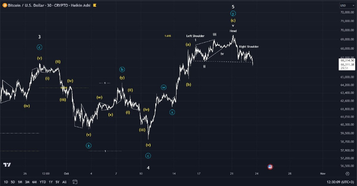 💰 Bitcoin Таймфрейм: 30m Сценарий продолжает реализовываться. Импульс вниз подтвердил образование конечной диагонали, также недавно произошло пробитие линии шеи фигуры смены тренда ГиП. Локально картина медвежья, ожидаю снижение с минимальной целью 61000.00. Криптовалютой торгую на бирже Bybit. #BTC