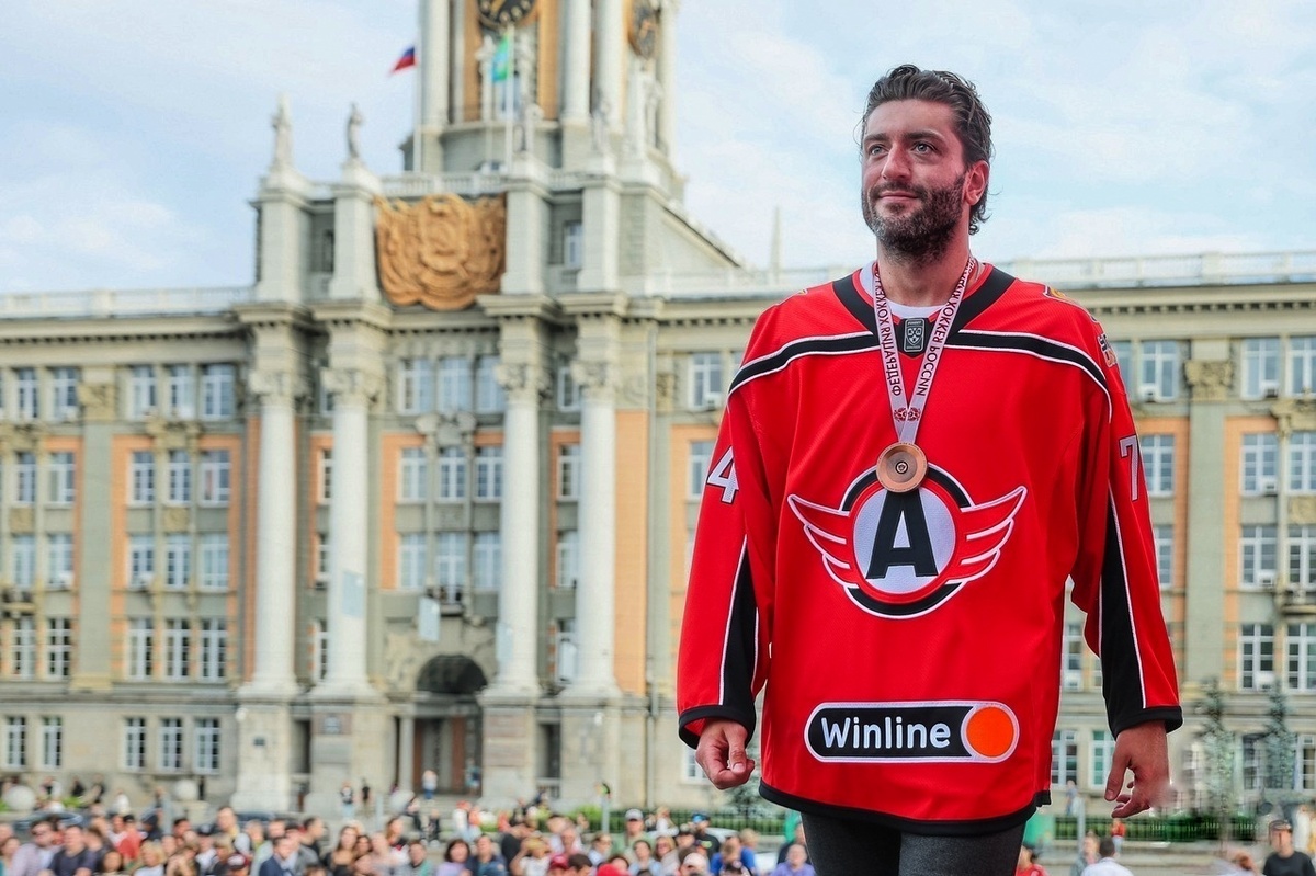 Фото: пресс-служба ХК «Автомобилист»/Ник Эберт на главной площади Екатеринбурга