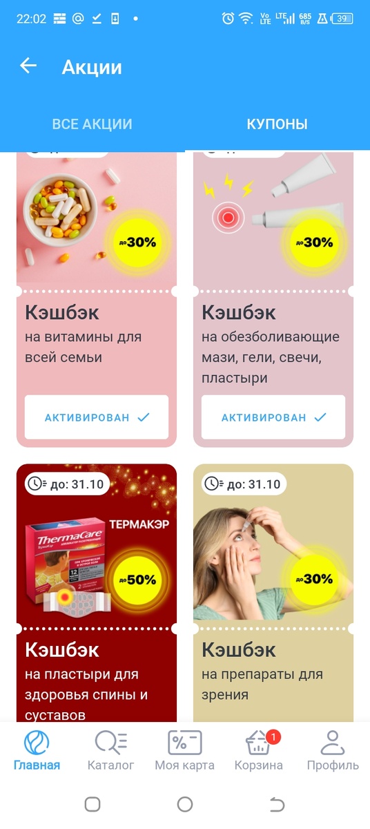 При заказе через сайт или приложение многие лекарства стоят меньше, чем в аптеке, кроме этого можно активировать акции с кэшбэком, но полученные баллы действуют только 14 дней. На все остальные покупки начисляется кэшбэк 2% и эти баллы не сгорают долго.