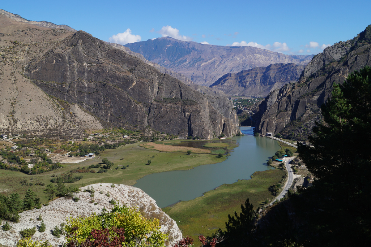 Когда-то мы засматривались телепередачами о волшебных видах в дальних странах и завидовали. Эх, нам бы такое. Оказалось, что просто у нас не умели ни ценить свое, ни снимать качественные видео. Все силы бросались на освещение пленумов с лысыми стариками. Постепенно научились делать программы и о путешествиях. А в самой большой стране мира не может не быть самого большого количества чудес. Надо уметь находить. Через дагестанские горы держим путь в Салтинскую теснину. Путешествие по этим серпантинам - само по себе удовольствие. Хотя, наверно, приедается. Год назад в это же время я катался по Ингушетии. Тогда восторг был сильнее. Хотя нынешние пейзажи ничуть не хуже. Видимо, прежние впечатления еще не выветрились. Надо впредь сменить направление. Вместо гор направиться в пустыню, что ли? Средь скал есть водохранилище Гунибской ГЭС им. Расула Гамзатова на речке Кара-Койсу. Плотину построили около 20 лет назад. Ее высота - 73 метра. Ширина по гребню вместе с проезжей частью - 8 метров. Затв