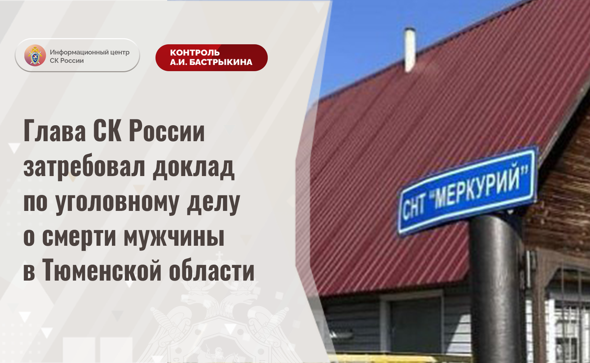 Глава СК России затребовал доклад по уголовному делу о смерти мужчины в Тюменской области В телеграм-канале сообщается о смерти 57-летнего жителя садового товарищества «Меркурий» Тюменской области. В октябре текущего года мужчина ушел в магазин, после чего домой не вернулся. Спустя две недели его тело обнаружено в лесном массиве деревне Решетникова с колото-резаным ранением бедра. В СУ СК России по Тюменской области по данному факту возбуждено уголовное дело по ст. 105 УК РФ (убийство). Председатель Следственного комитета Российской Федерации Александр Иванович Бастрыкин затребовал у и.о. руководителя СУ СК России по Тюменской области Дмитрия Викторовича Шермана доклад о ходе и результатах расследования уголовного дела. Исполнение поручения поставлено на контроль в центральном аппарате ведомства. #СледственныйКомитет #СКРоссии #СКР #ИЦСКР #ИнформационныйЦентр #АлександрБастрыкин #ПредседательСКР #КонтрольПредседателяСКР #КомментарийКонтроль #ТюменскаяОбласть