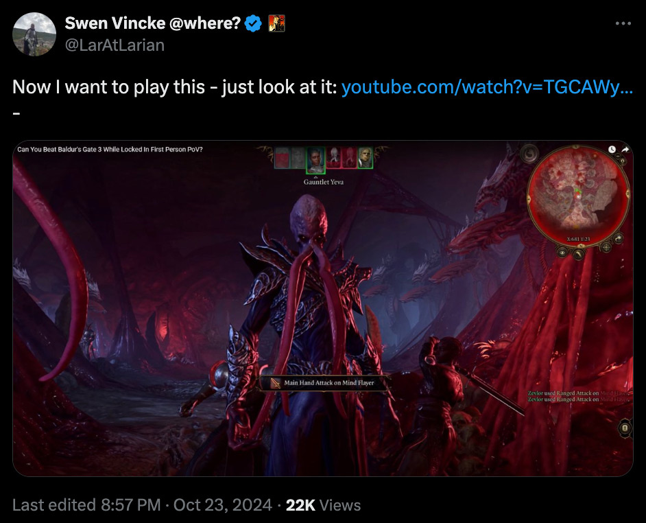 Мод для Baldur's Gate 3 с видом от первого лица впечатлил главу Larian