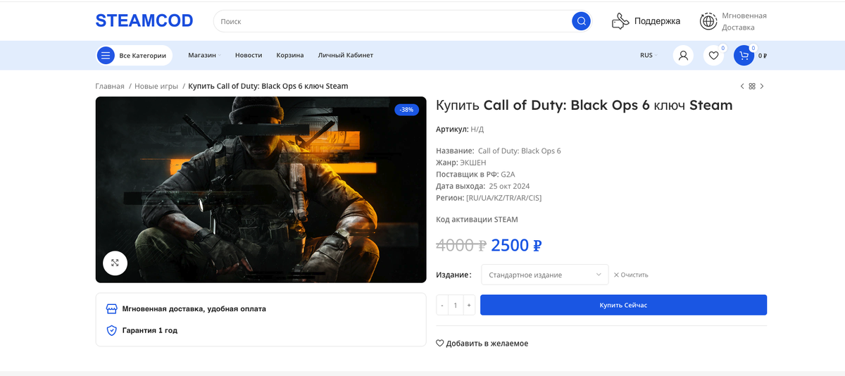 Покупка Call of Duty: Black Ops 6 в России в 2024 году может быть вызовом из-за санкций и ограничений в международных магазинах. Однако, игру можно приобрести через альтернативные магазины и сервисы, такие как BLIZZARD-GAMES, где предлагаются ключи для активации на таких платформах, как Steam. Цена игры может варьироваться, начиная от 2000 рублей, в зависимости от региона и издания. Актуально на лето 2025 - последняя информация STEAM https://steamcod.ru/product/купить-call-of-duty-black-ops-6-ключ-steam/ Blizzard https://battlecod.ru/11358/купить-call-of-duty-black-ops-6-для-pc-ключ Инструкция: