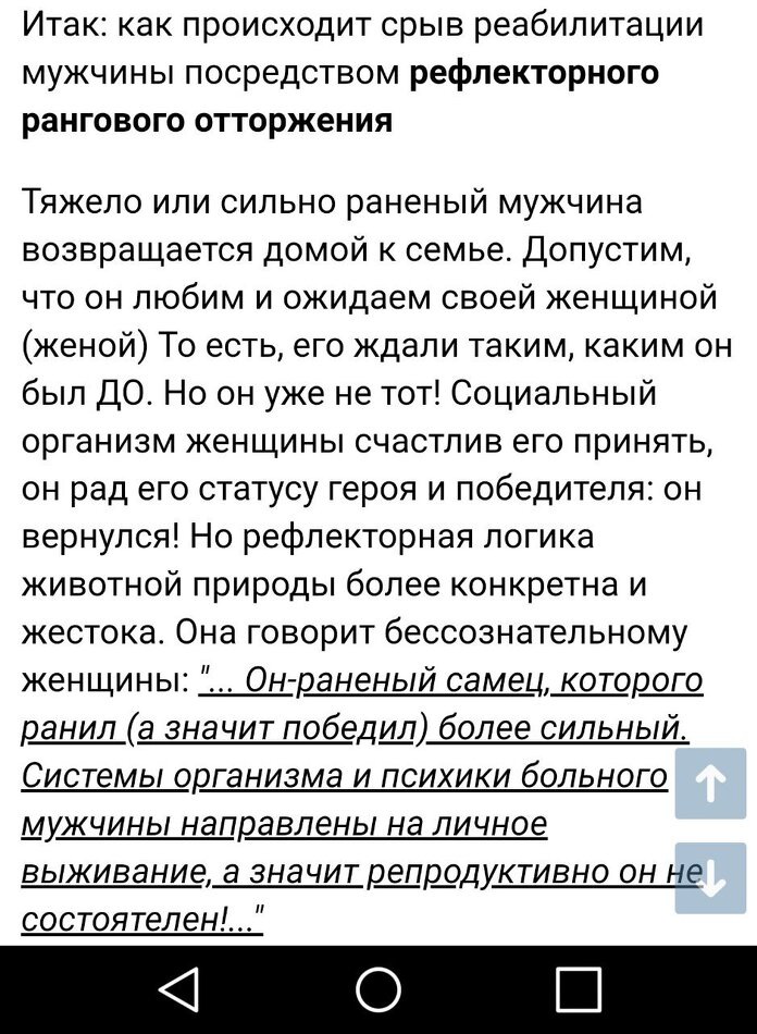 Сейчас же в отношении мужчины в современном социуме работают правила "расходного материала". Он - безличный ресурс; для женщины, для общества. Ему не положена специальная помощь (медицинская и психологическая например) как женщине, культурная прошивка "расходника" сидит в головах самих мужчин, которые считают доблестью пофигизм по отношению к своему здоровью.