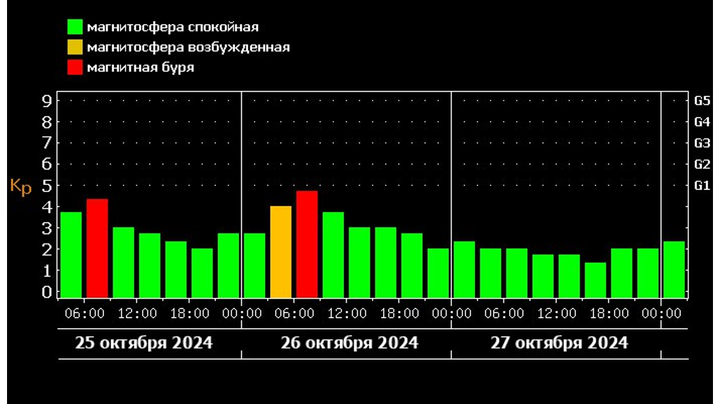 В субботу, 26 октября, прогнозируется слабое возмущение или буря минимального уровня G1. Будет оно или нет, сказать сложно — рекомендованные мировые модели дали вероятность события 20-30 %.