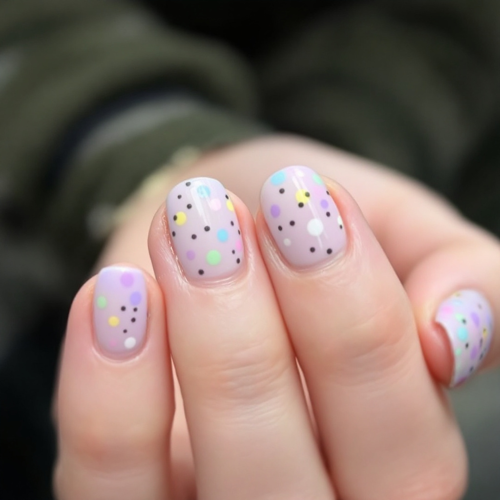 Лавандовый маникюр с яркими точками — идеальное всё-летнее настроение! Не забудьте про увлажнение кутикулы и регулярный уход. Делитесь своими идеями!
