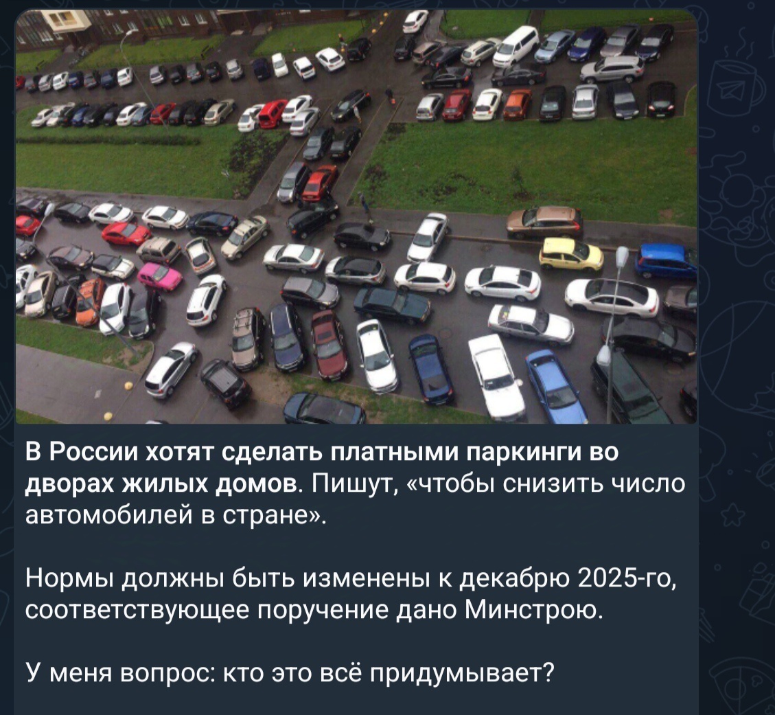 Сейчас ходит вот такая новость по интернету. Хотят изменить градостроительные нормы в плане размещения у домов стоянок для авто. Это ладно. Читаю новость какой то депутат Государственной Думы предлагает ввести уроки физкультуры на последний час. Кажется хорошая инициатива. Но это как посмотреть на проблемы. Что не так с первой новостью. По словам чиновников они хотят сократить количество машин в частном использовании. Хочешь иметь машину, плати за парковку. В этом все хорошо, но есть несколько НО! Я считаю, что эту тему двигают застройщики. Они хотят по максимуму застраивать многоэтажками выделяемые территории под ЖК. Другой момент, кто то хочет иметь доход от платных парковок. Таким образом он проталкивает эту тему. В новостройках давно имеется проблема с парковками, особенно в больших городах. Вернее в новых районах больших городов. К примеру в Москве Коммунарка или Новые Ватутинки. В Подмосковье можно назвать ДК Равновесие или Высокие Жаворонки. Новые микрорайоны, а машиномест ма