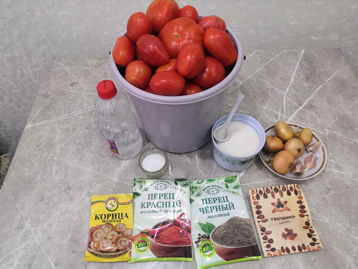 Для приготовления ароматного домашнего кетчупа нам понадобится: Томаты промыть, лук и чеснок почистить и нарезать все кусочками для мясорубки. Пропустить все овощи через мясорубку с крупной решёткой. Получится примерно 5л пюре. Поставить пюре на огонь и подождать закипания. Варить 1 час при слабом побулькивании, без крышки, время от времени помешивая. Дать пюре немного остыть и пропустить через мелкое металлическое сито небольшими порциями помогая себе ложкой. Жмых (кожицу и семена) выбросить. Кастрюлю с овощным соком поставить обратно на плиту. Варить ещё 1 час при слабом кипении, без крышки, время от времени помешивая. Кетчуп уварится примерно вдвое (можно варить дольше, чтобы получилась более густая консистенция). Добавить сахар. Добавить соль. Добавить корицу. Добавить красный перец. Добавить черный перец. Гвоздику перевязать в марлю и добавить в кетчуп. Потом его нужно будет выловить и выкинуть. Варить 20 минут помешивая. Влить уксус и варить ещё 10 минут, после чего выкинуть гв