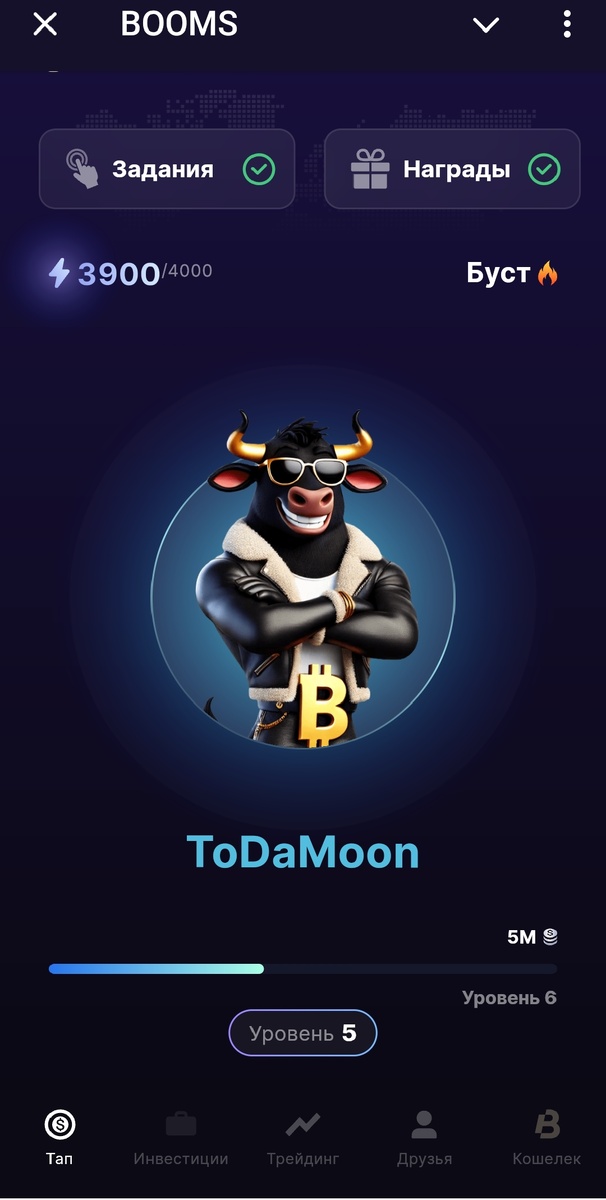 BOOMS — это кликер-игра в Telegram. В ней игрокам предстоит развивать уровень своего виртуального быка. Чтобы зарабатывать очки, можно просто нажимать на экран или выполнять легкие задачи, такие как подписка на социальные сети проекта или приглашение друзей. Ключевая особенность игры — это ежедневные турниры, в которых участники могут заработать токен $BOOMS. Этот игровой ресурс уже имеет установленный курс: 1000 $BOOMS равняется 10 USDT. Так же в игре во вкладке Трейдинг есть режим торговля криптой. В данном режиме можно торговать: В заключение хочется сказать, что игра весьма интересная, за счет разнообразных турниров по трейдингу, поэтому стоит начать и попробовать себя в этом деле. В игру не нужно вкладывать своего капитала. Всем удачи! И не забудь подписаться на канал. Игра ✴️ Telegram канал ✴️